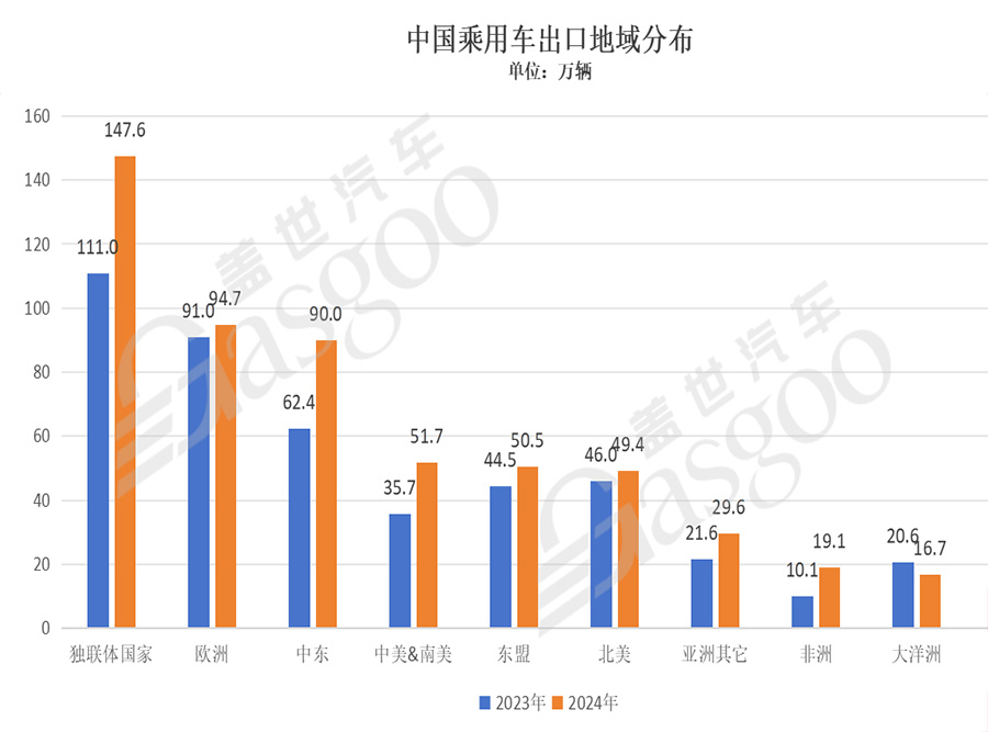 2024年,中国汽车出海成绩斐然,乘用车出口量达到549 5万辆,相较于去年实现了24%的增长,稳居全球汽车出口第一大国。从地域市场来看,独联
